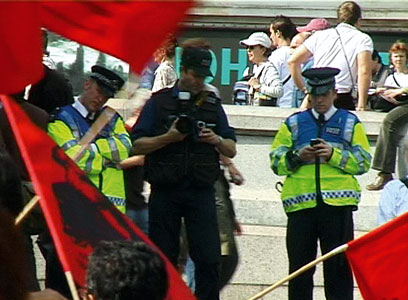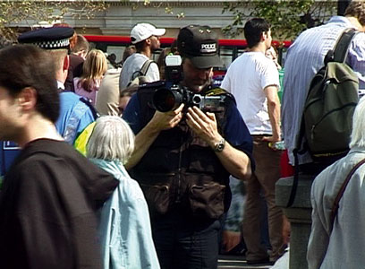In Trafalgar Square, there was a policeman dressed entirely in black holding a stills camera and concealed video camera. This "Forward Intelligence Team" officer, was accompanied by two uniformed policemen wearing high visibility jackets. I saw them standing on the north steps of the square and proceeded to film them in full view of them and the surrounding crowd. For the next half hour or so, I followed and filmed this group of three as they moved around the square. When I viewed my footage later that evening I realized that they had also been filming me.
